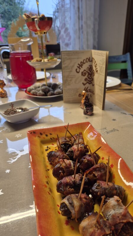 Ich habe als Gastgeberin an dem Abend die Rolle der Odette übernommen, was auch sehr gut in die Geschicht passt. Für den Apperitiv habe ich Sektgläser mit einem Schokorand und Glitzer verziert, dazu gab es Schokofrüchte. Zum Nachtisch natürlich Schokolade, die ich zuvor im „Schaufenster“ der Chocolaterie zusammen mit dem Buch „Träume aus Schokolade“, das das Mordopfer ja noch veröffentlicht hatte, dekoriert hatte. Im Hintergrund liefen französische Chansons.