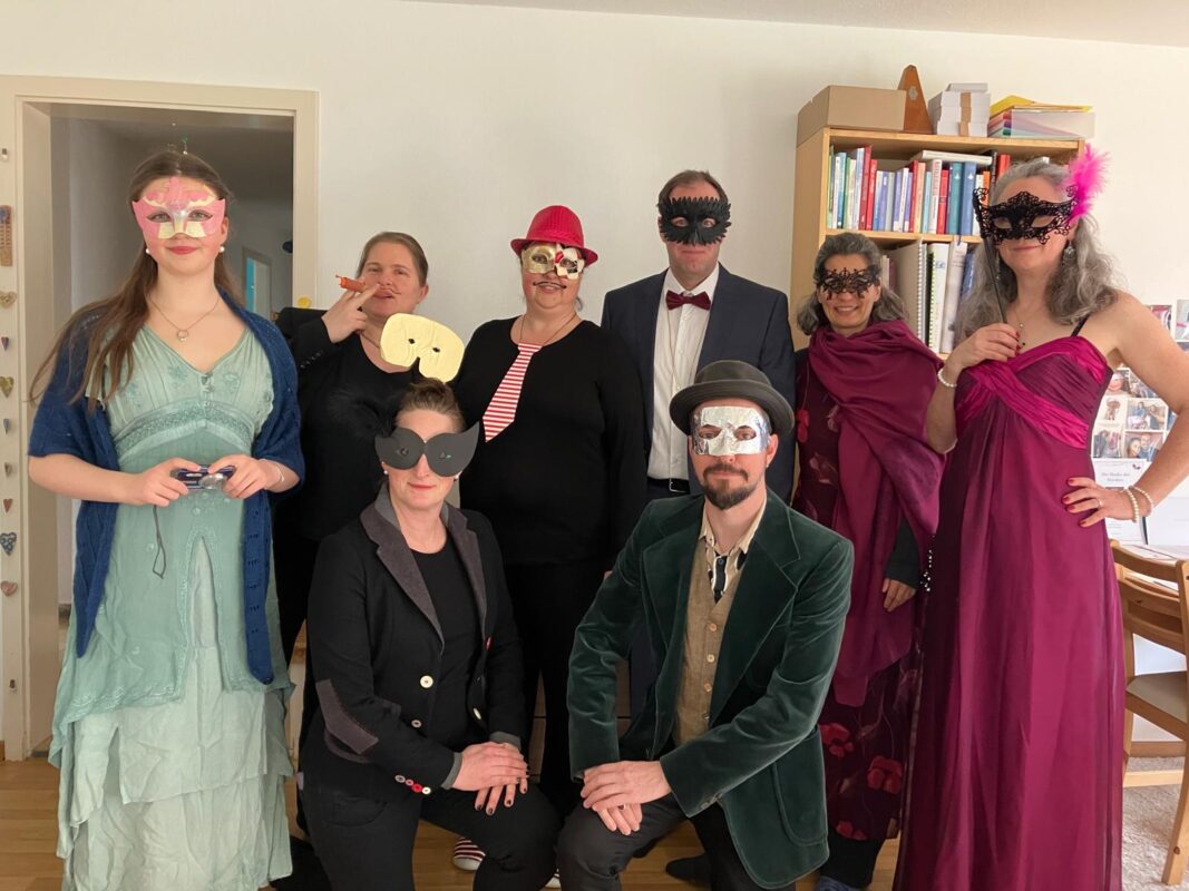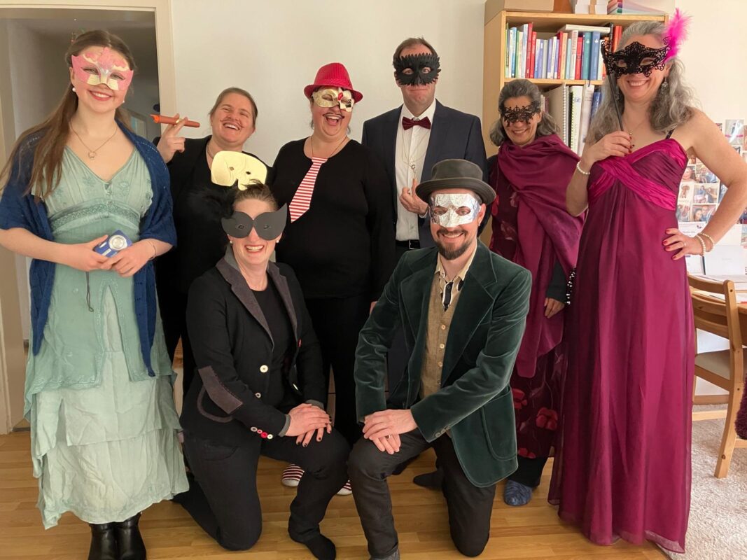 Wir haben das Krimidinner „Die Maske des Mörders“ extra thematisch passend für den Silvesterabend ausgewählt und nun mehr in einer Gruppe von 8 Personen gespielt. Alle haben sich mit denen ihnen zugewiesenen Rollen prima zurecht gefunden und sich auch entsprechend verkleidet.
